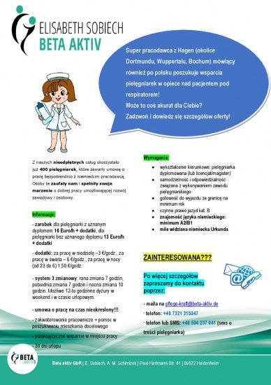 Po więcej szczegółów zapraszamy do kontaktu poprzez: - maila na pflege-(skorzystaj z formularza) - telefon: +49 7321 315047 - telefon lub SMS: +48 504 237 041 (sms o treści pielęgniarka)